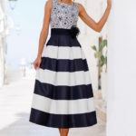 Robe longueur Midi en satin noir et blanc avec une large ceinture drapée à la taille ornée d’une fleur en tulle noir.