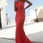 Robe tapis rouge longue et évasée en dentelle
