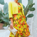 Robe fluide de forme trapéze sur fond jaune et imprimé floral multicolore accompagnée de son spencer en crêpe de couleur jaune citron.